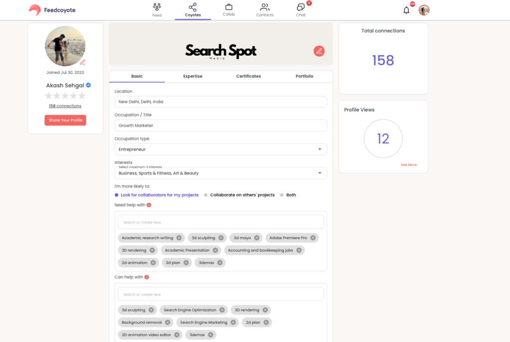 Clear service descriptions help partners understand exactly how you can contribute. Precise skill tagging is also crucial, as it helps Feedcoyote’s matching algorithm connect you with relevant collaborators and projects.