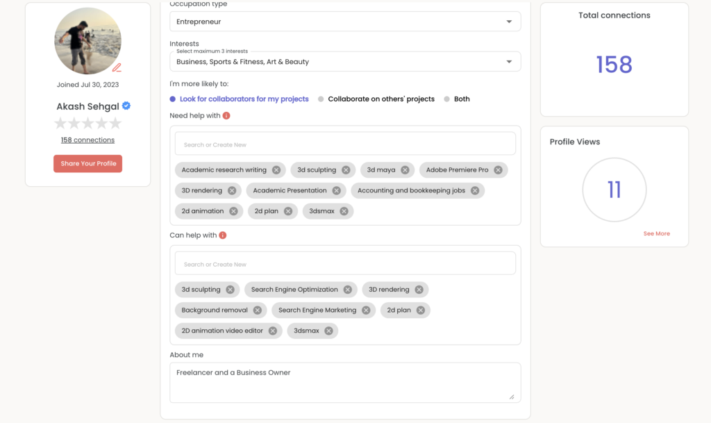 Crucial Distinction: The tags in “Need Help With” and “Can Help With” must be distinct. They represent two different sides of the collaborative coin, and the AI leverages this separation for precise matching. If you use “Content Writing” in both, the AI won’t know if you’re offering or seeking it.